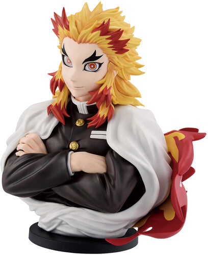 Standing at approximately 7.9" tall, Kyojuro Rengoku is seen in their popular pose. This detailed bust features gloss eyes and vivid expression.