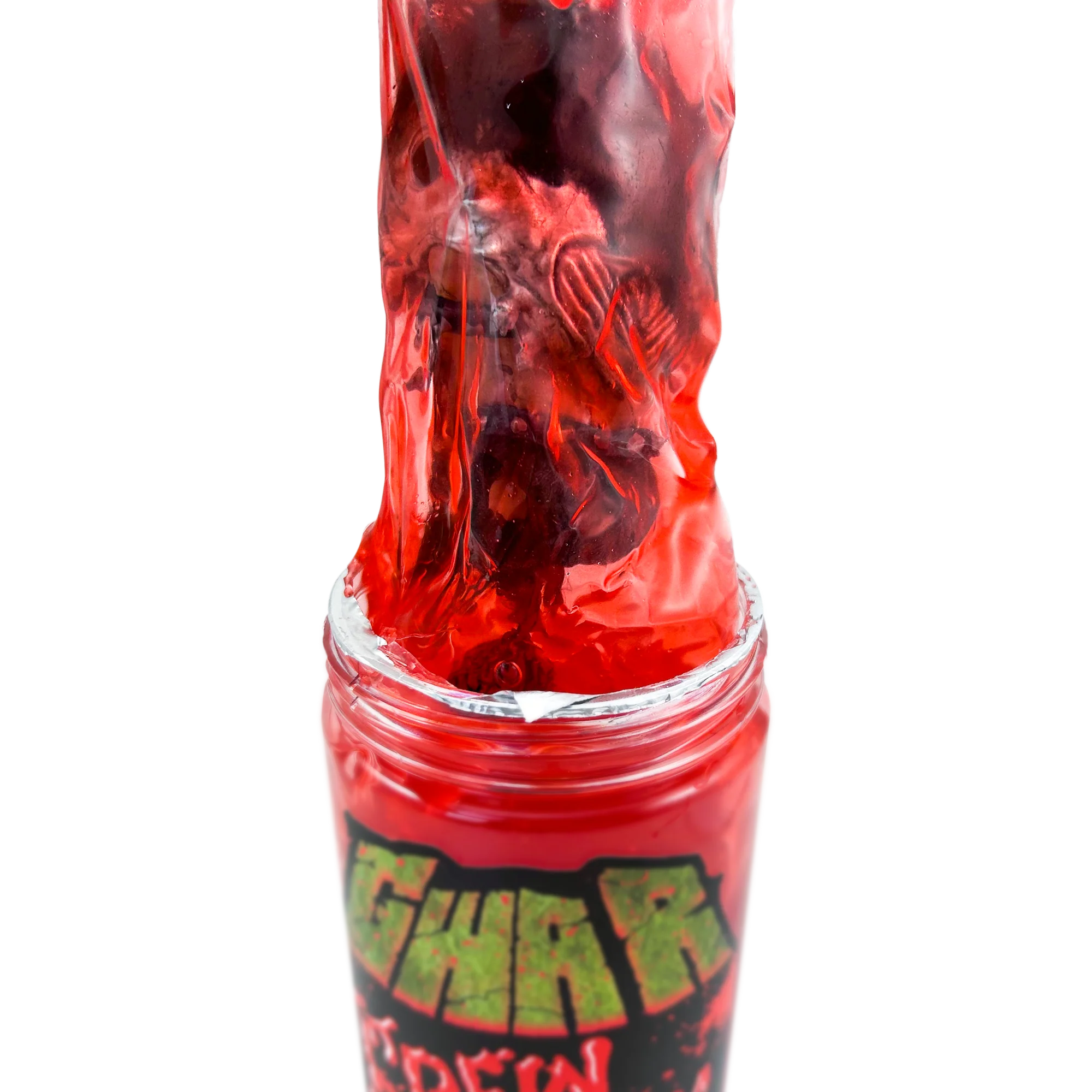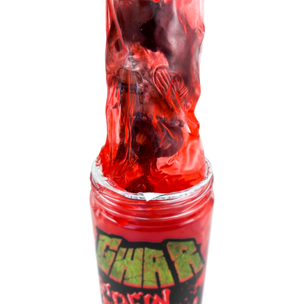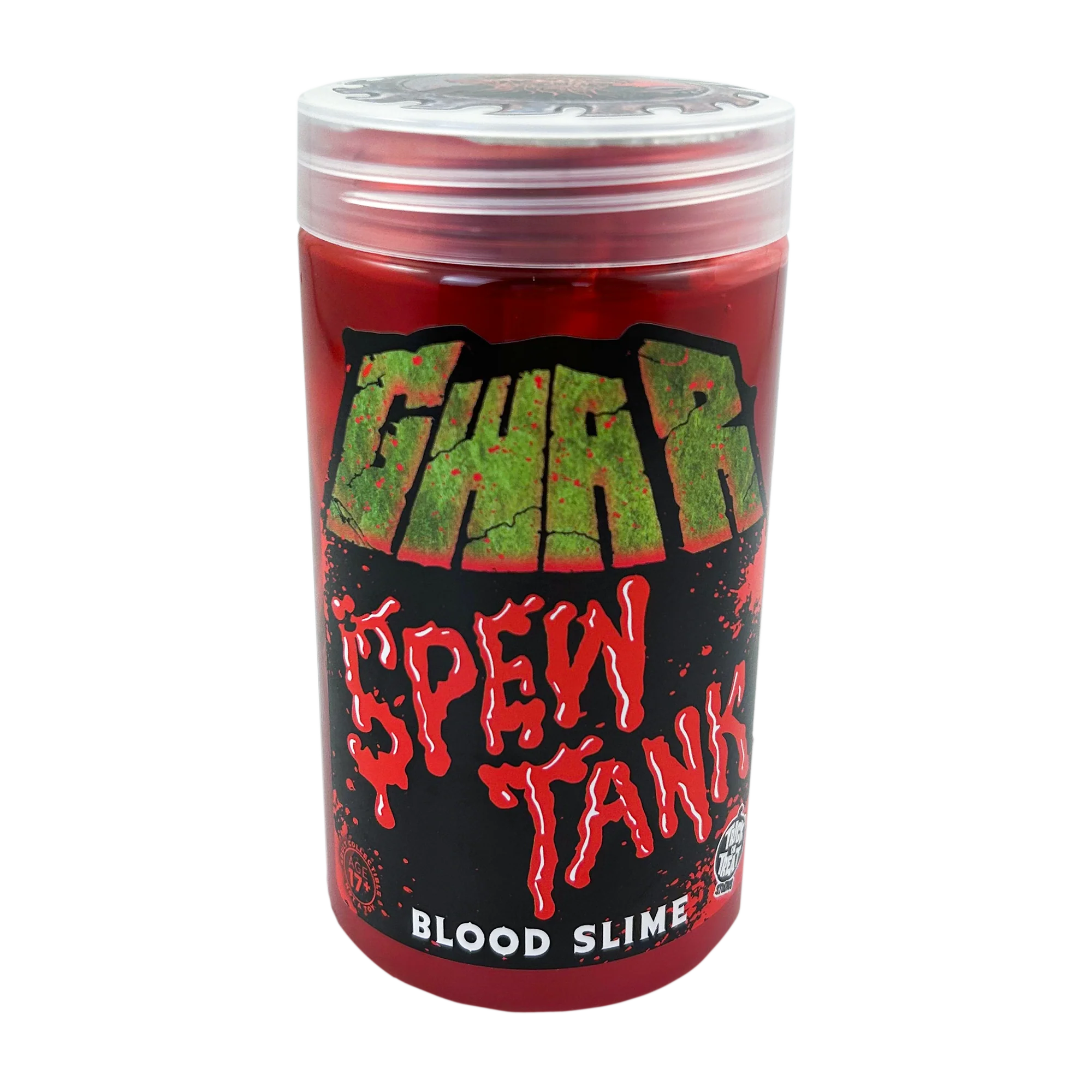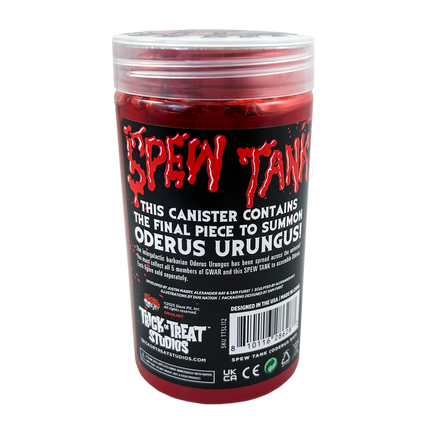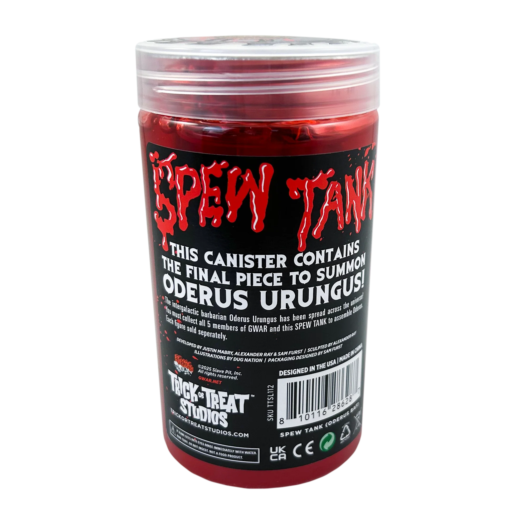 Your GWAR collection is about to get even more disgusting. The Spew Tank is a TANK (plastic jar with a screw top lid), filled with vile RED SPEW (translucent red blood slime) and the final, most important pieces of the Scumdog leader —Oderus Urungus!