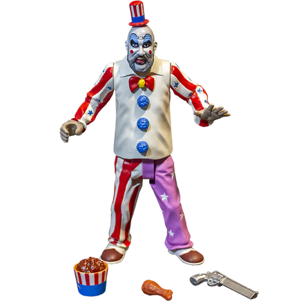 Howdy Folks! You like blood? Violence? Freaks of nature? Well, then boy do we have something for you! Trick or Treat Studios is thrilled to present the House of 1000 Corpses - Finger Lickin' Pistol Whippin' Captain Spaulding - Action Figure! This figure features Finger Lickin' Pistol Whippin' Action, and includes great accessories - tasty fried chicken bucket and drumstick along with a pistol for all your action needs. Packaged in retro style action figure packaging just like your favorite figures from the toy aisle. Backing card features art by Dug Nation.
