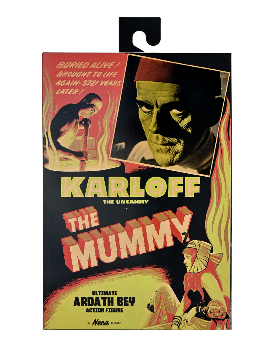 Unwrap the latest Ultimate Universal Monsters figure from NECA! Portrayed by Boris Karloff in the classic 1932 film The Mummy, Ardath Bey is an Egyptian high priest mummified for trying to revive his lover in this tale of love transcending death. Standing in 7-inch scale, this action figure includes multiple interchangeable heads and hands, oil lamp, cane, Scroll of Thoth, and sacrificial dagger. Comes in collector-friendly window box packaging with opening front flap. Unwrap the latest Ultimate Universal Monsters figure from NECA! Portrayed by Boris Karloff in the classic 1932 film The Mummy, Ardath Bey is an Egyptian high priest mummified for trying to revive his lover in this tale of love transcending death. Standing in 7-inch scale, this action figure includes multiple interchangeable heads and hands, oil lamp, cane, Scroll of Thoth, and sacrificial dagger. Comes in collector-friendly window box packaging with opening front flap.