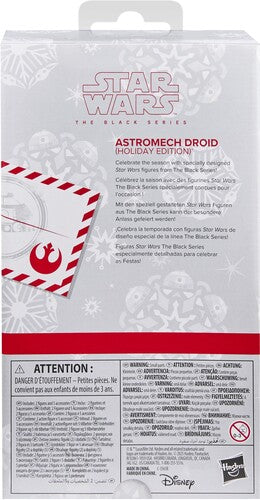 This Star Wars Hasbro action figure is detailed to look like a festive astromech droid with red and green deco, plus a soft goods Santa hat and includes accessories: a candy cane, 3 droid tools, 2 jet thrusters, and 2 flame FX with exquisite features and decoration, Pose out Grogu -- dressed up in a Santa suit, coming in at about 1 inch tall within a 6-inch scale -- with the droid figure. The Black Series embodies the quality and realism that Star Wars devotees love.