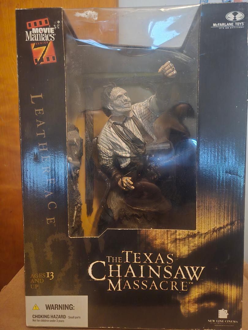 12-inch Leatherface from The Texas Chainsaw Massacre is 12 1/4 inches tall on base to top of head. Assembled diorama base is 18 1/2 inches tall. Package includes Leatherface action figure, huge multi-part base, removable chainsaw, a rope pulley and a severed arm. Box has remains of price sticker and is creased and worn.
