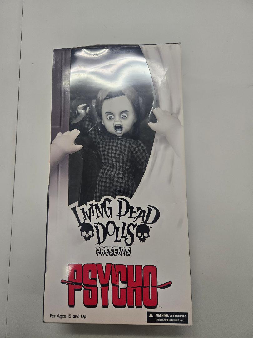 Living Dead Dolls (LDD) Presents: Psycho is a collectible doll series by Mezco Toyz featuring characters from Alfred Hitchcock's classic horror film Psycho, specifically focusing on the iconic Norman Bates dressed as his mother ("Mother"). The Norman doll features a removable wig, realistic details like pants under his dress, and a knife, capturing the film's terrifying moment.