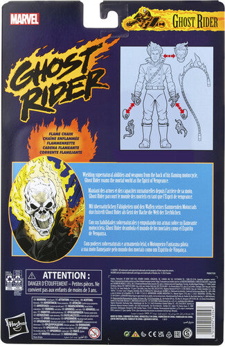 Wielding supernatural abilities and weapons from the back of his flaming motorcycle, Ghost Rider roams the mortal world as the Spirit of Vengeance. The vengeance-seeking Ghost Rider rides into Marvel Legends with this 6-inch comics figure, features classic deco from Johnny Blaze’s appearances throughout the comics, is highly posable for display and play and includes 6 character-inspired accessories -- including the flame chain! This Ghost Rider figure comes in retro-style packaging to recreate the classic Marvel Legends releases!