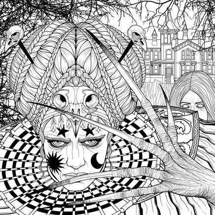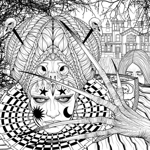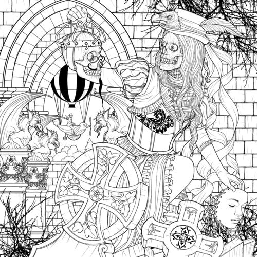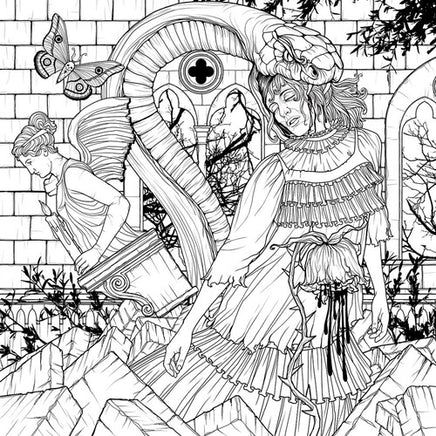 The Mythogoria series offers colorists a walk on the dark side. With original illustrations of great detail and imagination depicting bloody horror scenarios, this series combines a passion for creative art with a predilection toward the gruesome. Grotesque Glamour is a collection of high-style murderers and femmes fatales, full of decadence and gore.