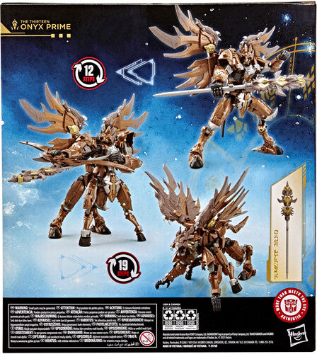 This 7.5-inch The Thirteen Onyx Prime action figure converts between robot, centaur, and beast modes in 12 and 19 steps. Includes a spear and Triptych Mask Artifact accessory that the figure can hold in robot and centaur modes. The figure's tail can be removed and opened into a bow accessory. The Thirteen Onyx Prime figure is inspired by the character from the Transformers universe and features articulated head, arms, and legs for awesome action poses.